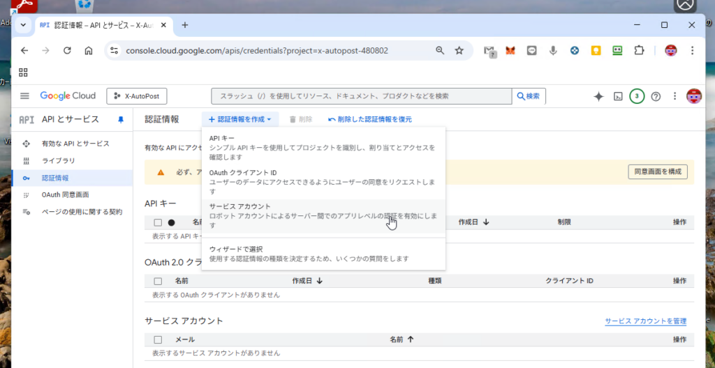 - 画面上部の「+ 認証情報を作成」をクリックし、「サービスアカウント」を選びます。