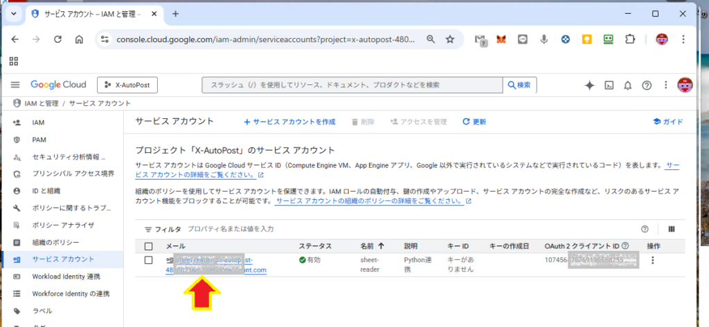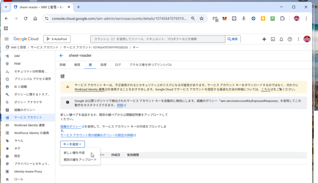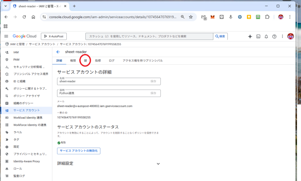 ...iam.gserviceaccount.comというようなやつ)がリストに表示されるので、その行の右側にある「ペンアイコン(編集)」をクリックします。 - 上部のタブから「キー」を選びます。