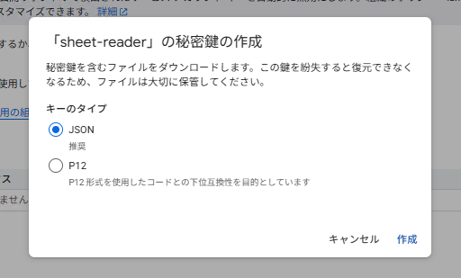 - キーのタイプで「JSON」が選ばれている状態で「作成」を押します。